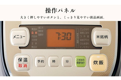 炊飯機、計量カップ(白米用・無洗米用)、しゃもじ、洗米棒●電源AC100V(50/60Hz共用)●定格消費電力(炊飯時)1230W【炊飯器】●炊飯容量(最大)無洗米・白米:1.0L(5.5合)炊込み:0.54L(3合)おかゆ:全がゆ0.27L(1.5合)、5ぶがゆ0.09L(0.5合)玄米・高速炊き・食物繊維米:0.54L(3合)●区分名B ※1●蒸発水量52.5g ※1●年間消費電力量94.7kWh/年 ※1●1回あたりの炊飯時消費電力量176.7Wh ※1●1時間あたりの保温時消費電力量20.4Wh ※1●1時間あたりのタイマー予約時消費電力量0.95Wh ※1●1時間あたりの待機時消費電力量0.67Wh ※1【しゃもじ】●材質ポリプロピレン●耐熱温度120度【計量カップ】●材質ポリプロピレン●耐熱温度120度●容量白米用(1合):180mL白米用(0.5合):90mL無洗米用:171mL●銘柄選択表【こしひかり】あいちのかおり/こしいぶき/こしひかり魚沼産こしひかり/彩のかがやき/さがびより【あきたこまち】あきたこまち/キヌヒカリ/きらら397/つがるロマン【つや姫】つや姫/はえぬき/ハツシモミルキークイーン/夢つくし【ゆめぴりか】あさひの夢/ななつぼし/ふっくりんこまっしぐら/ゆめぴりか【ひとめぼれ】きぬむすめ/元気つくし/ササニシキ/天のつぶにこまる/ひとめぼれ/みずかがみ/森のくまさん【ヒノヒカリ】あきほなみ/くまさんの力/ヒノヒカリ/ふさこがね※商品の仕様は予告なく変更することがあります。
